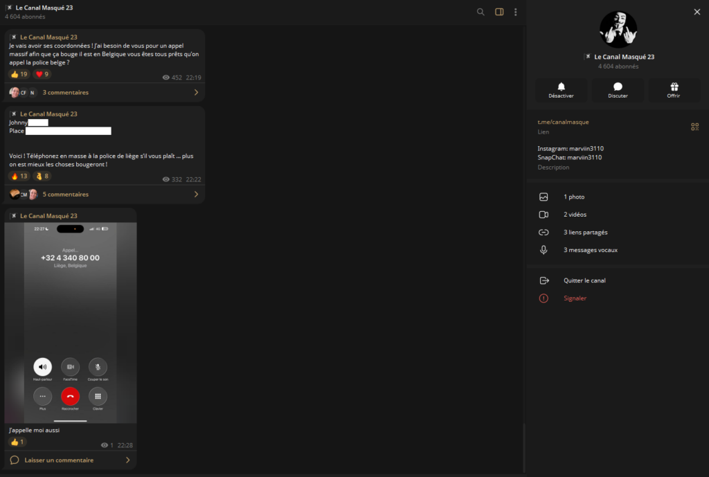 Ces agissements ne se sont pas arrêtés là : un canal Telegram a ensuite été créé afin de poursuivre ce harcèlement en dehors de la plateforme initiale. Sur ce canal, mon adresse postale a été diffusée à plus de 4 000 personnes, mettant clairement en danger ma sécurité et portant atteinte à ma vie privée.
